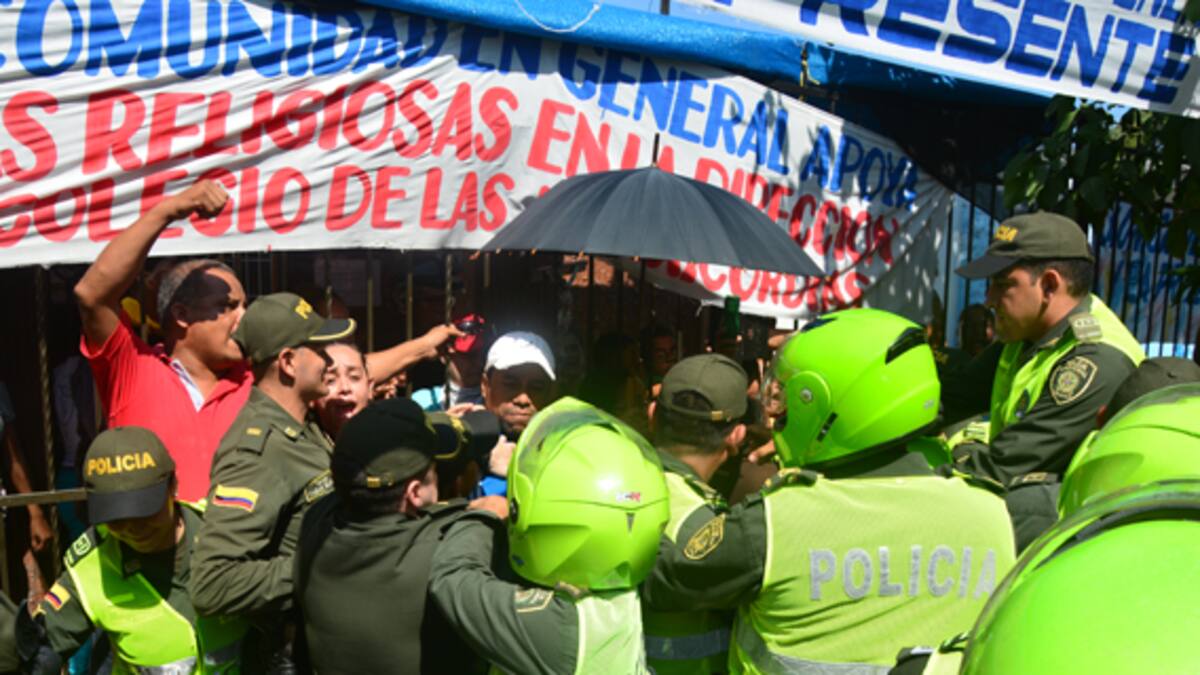 Las estudiantes de undécimo grado del colegio Nuestra Señora de Las Misericordias no podrán recibir su titulo hoy como lo tenían planeado. Más de 70 policías irrumpieron ayer a la fuerza a las instalaciones de la institución en donde se encontraban los padres de familia que, desde el pasado 13 de julio, no dejaban entrar a la nueva rectora del colegio, Rosa Belén Suárez, para que ejerciera su cargo.