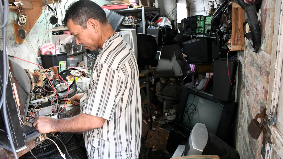 Televisores gordos, viejos y polvorientos reposan en los estantes de este edificio gris y oscuro, en donde estos hombres se encargan de darles un nuevo comienzo.