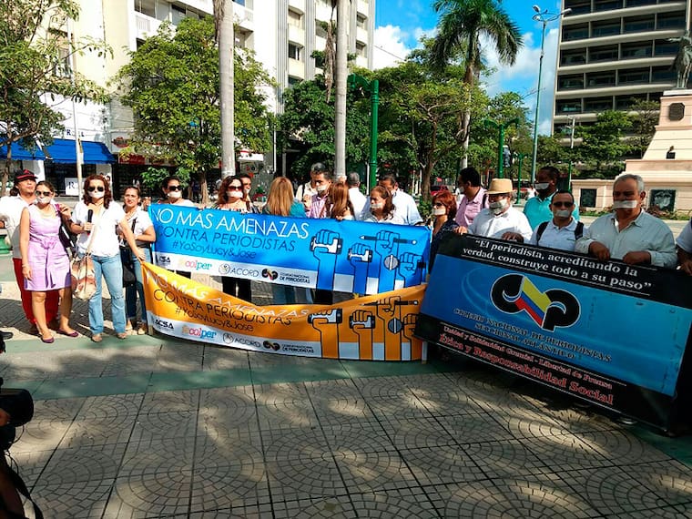 Los periodistas, con pancartas en mano, están reclamando resultados de las investigaciones por el envío de sufragio a José Gómez y a Lucy Flórez a la oficina del informativo que ellos dirigen. Noticia en desarrollo.
