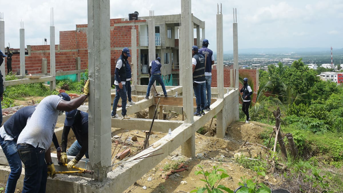 Funcionarios de la Secretaría de Control Urbano y Espacio Público, la Policía Nacional y el Escuadrón Móvil Antidisturbios (Esmad) participaron en la operación que se ordenó tras encontrar que las obras se ejecutaron sin licencia y en un terreno no apto, según el Plan de Ordenamiento Territorial (POT), debido a la alta amenaza de remoción.