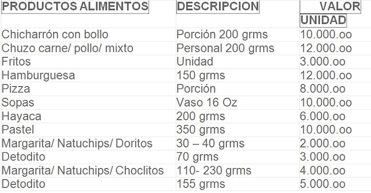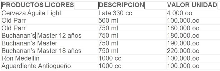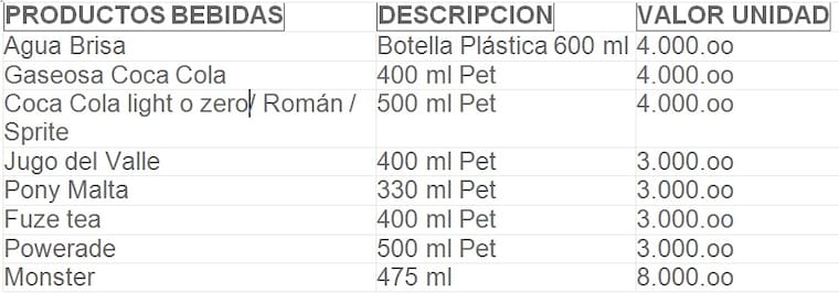 Según la lista autorizada, productos como agua y gaseosas tendrán un precio de $4.000, mientras que los licores tendrán precios que van desde los $100 mil hasta los $220 mil.