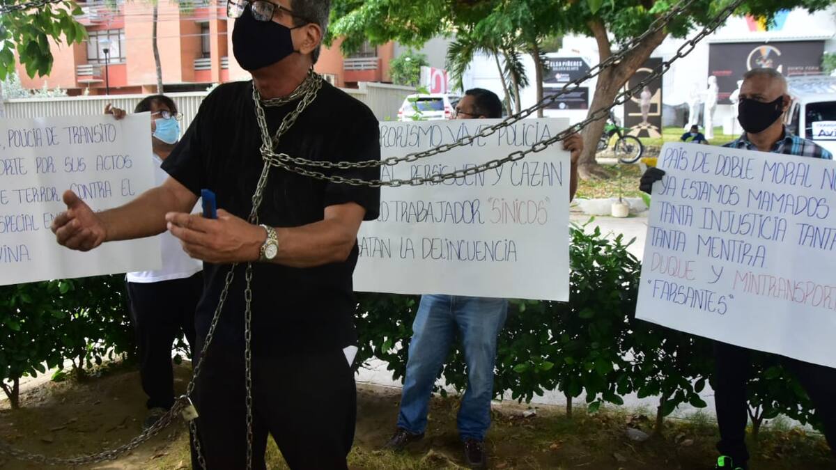 Con pancartas y encadenados a un árbol, el gremio de transportadores escolares de Barranquilla realizó un plantón a las afueras de la sede territorial del Ministerio de Transporte, ubicada en la carrera 57 con calle 75, para exigirle al Gobierno que los tengan en cuenta en los planes de crédito y alivio financiero que se les ha dado a otros sectores de la economía.