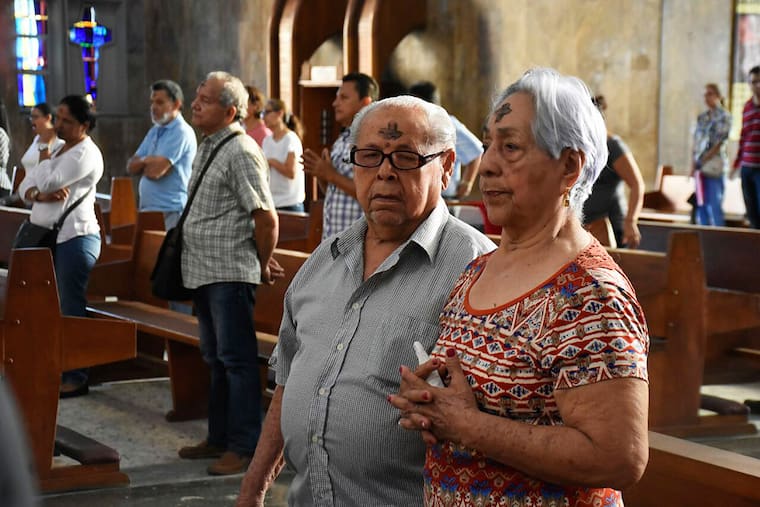 'Siempre venimos juntos a la iglesia, tenemos más de 60 años de casados y desde que nos mudamos cerca de la Catedral, hace como 14 años, venimos a colocarnos la cruz', afirma María Barrios mientras ayuda a sentar a su esposo Miguel Ángel, luego de colocarse ambos la ceniza.