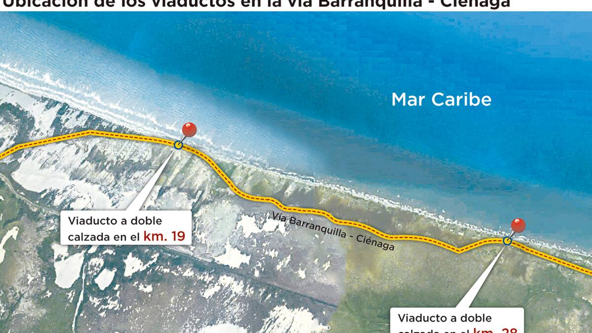 Para la ampliación en doble calzada de la vía Barranquilla-Ciénaga, la solución aprobada por la Agencia Nacional de Licencias Ambientales (Anla) contempla la construcción de dos viaductos en los puntos críticos de la erosión costera: los kilómetros 19 y 28 de la carretera.