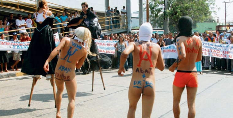 Los estudiantes de la universidad del atlántico que se encuentran en protesta por el posible cierre de esta alma mater se desnudaron en protesta y pintaron sus traseros con la frase abajo uribe,por la medida que el gobierno quiere tomar.