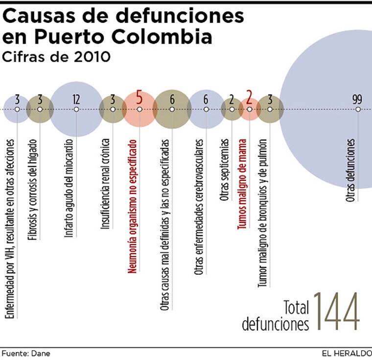 De acuerdo con el documento entregado por Orgambiental, a cargo de la operación de las estaciones de medición de calidad del aire en Atlántico, en Puerto Colombia las principales causas de morbilidad en niños menores de cinco años a corte de 2011 son las Enfermedades Diarreicas Agudas, EDA, e Infecciones Respiratorias Agudas, IRA. (Ver infografías)