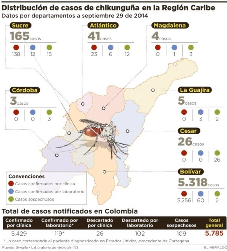 Bajo impacto demográfico. La Secretaría de Salud indicó que la cifra, pese al impacto que su lectura puede ocasionar inicialmente, 'es baja si se tiene en cuenta que Bolívar alberga una población de más de un millón de habitantes, que viven en zonas propensas a la presencia y cría natural y doméstica de insectos como los transmisores del chikunguña, dengue y otras patologías virales y parasitarias de origen vectorial'.