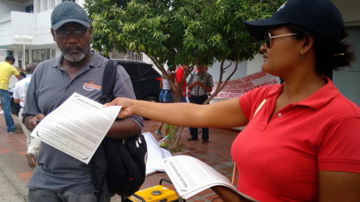 A esta hora de la mañana, un grupo de usuarios realizan una protesta con mensajes grabados, musicalizados y reproducidos con parlantes, a la entrada de las oficinas de la Nueva Eps, del barrio Manga.