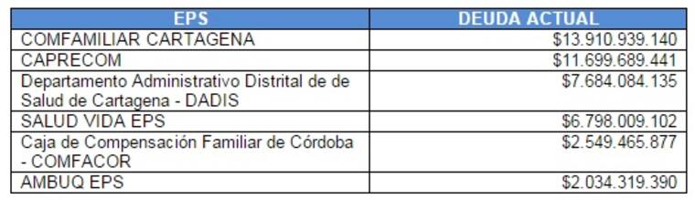 La actual gerente Elga Ehrhardt Gutiérrez dijo que el Distrito es uno de los mayores deudores del hospital, así como centros de atención de municipios de Bolívar. La deuda total con el HUC es de unos $72.000 millones de pesos.