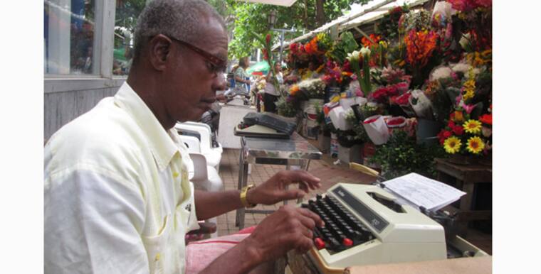 Las redes sociales y la tecnología fueron desplazando a los escribanos que hoy han tenido que arrinconarse en un espacio del Parque de Las Flores. En total son 17 las personas que se ganan la vida con sus máquinas de escribir elaborando ya no cartas de amor sino declaraciones de renta, balances, documentos y demás.