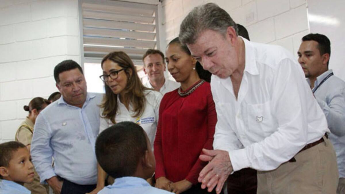 Santos, quien llegó compañía de la ministra de Educación, Gina Parody, después de saludar a los niños, tomó pinturas con los colores amarillo, azul y rojo, y plasmó las huellas de sus manos en el que desde hoy será el mural de la paz.