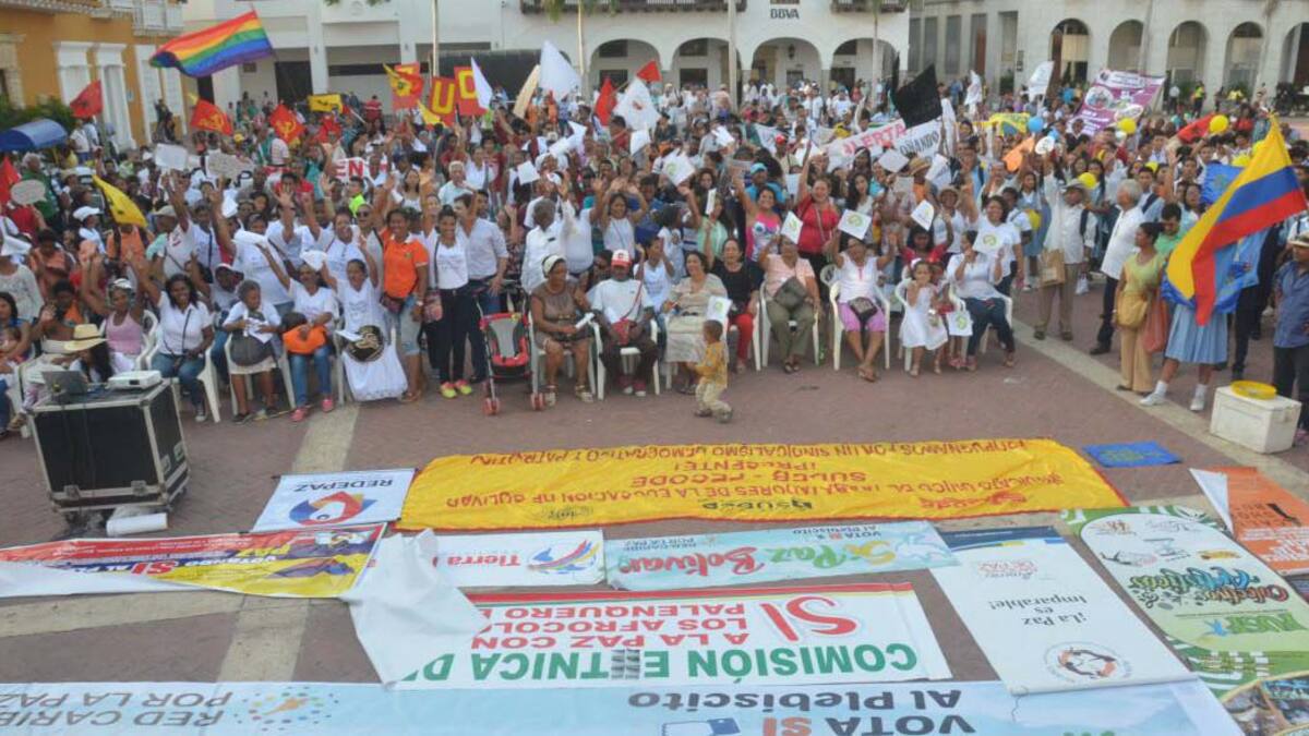 'No queremos más guerra', gritaron decenas de seguidores del ‘sí’ a la paz, que votarán afirmativamente en el plebiscito. Se congregaron en la Plaza de La Aduana, en el corazón de la ciudad amurallada, para reafirmar su voluntad de resolver el conflicto armado con diálogo. Organizaciones afro, las centrales obreras, la comunidad LGTBI, las víctimas del conflicto y estudiantes universitarios y de colegios, entre otras, llevaron pancartas y mensajes alusivos a la paz. Una niña leyó un poema en tarima que hizo estallar en aplausos a los presentes.