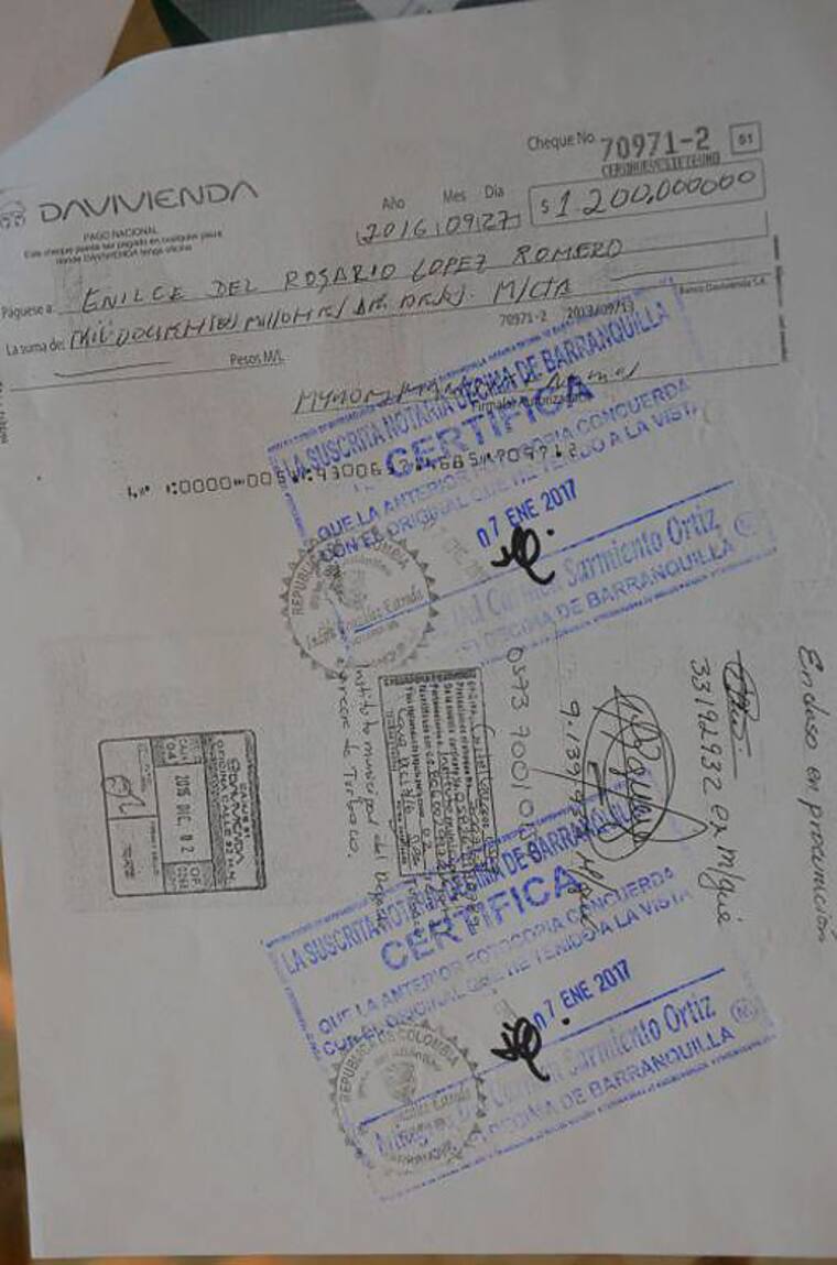 Un cheque por $1.200 millones girado a la exempresaria del chance Enilce López Romero tiene envuelto en líos jurídicos al exalcalde del municipio de Turbaco, Myron Martínez Ramos. El documento está fechado de septiembre 27 del año pasado, está firmado por el exmandatario local y sería de la chequera en la que se manejan las cuentas del Instituto de Recreación y Deporte de Turbaco.