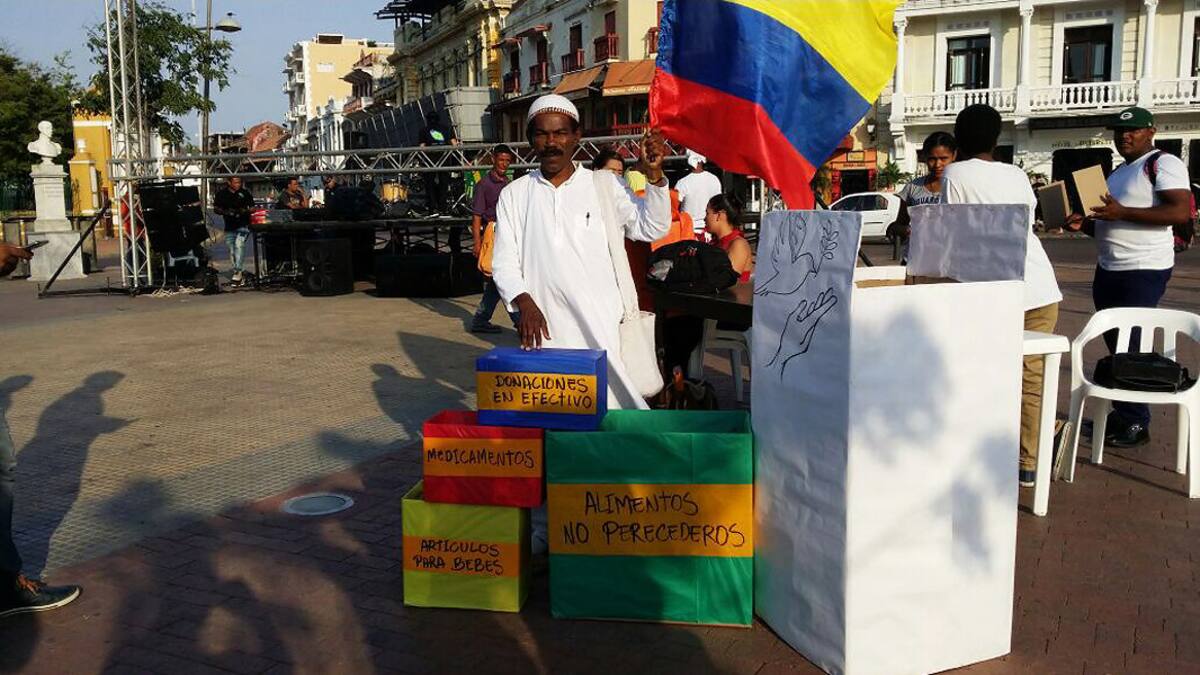 Como parte de la Caravana Humanitaria por la Paz, que busca proveer de insumos básicos a los excombatientes de las Farc que permanecen en la zona veredal de Pondores, en La Guajira, Cartagena acogió desde las 5:30 de la tarde de este jueves el concierto social 'Venga esa mano por la paz'.