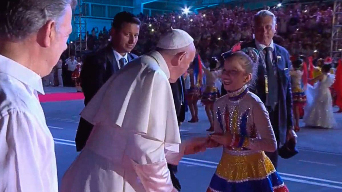 Detalló que estaba muy emocionada. 'Yo me acerqué a entregarle los regalos, me dio las gracias por eso y que muchas gracias por el espectáculo. Luego de que su escolta recibiera el regalo, me bendijo un rosario que ‘La Negra’ (miembro de la Banda) me entregó y me bendijo a mi'.