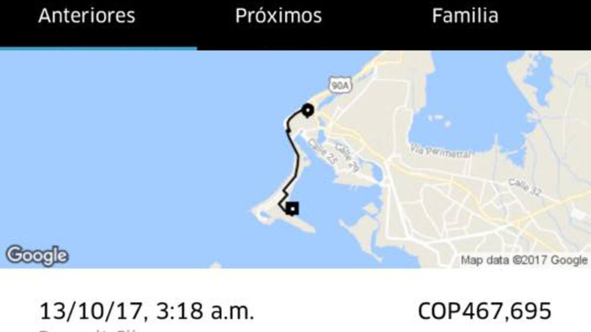 Según la denuncia que hizo Arrázola a través de la publicación en la red social en la aplicación se ve el cobro a su tarjeta de crédito por el viaje que realizó del centro a Castillogrande y quedó sorprendida al verificar dicho cobro.