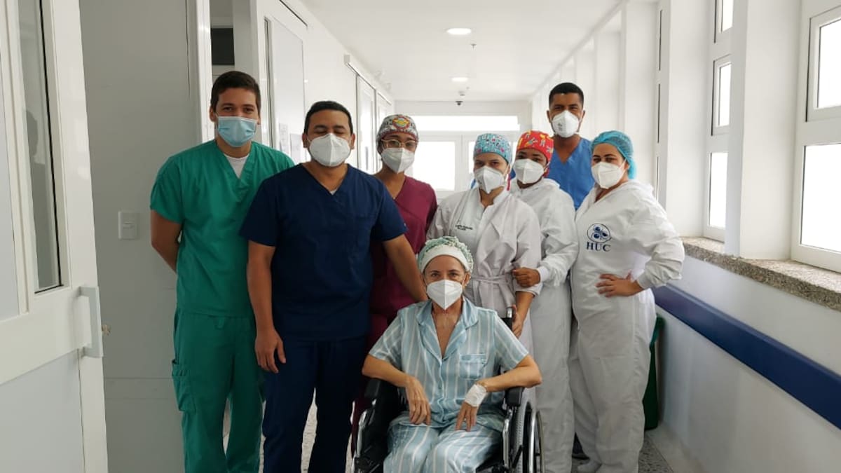 Rodeada de su esposo Javier Oliveros, y de parte de los médicos y las enfermeras que la atendieron, salió este martes del Hospital Universitario del Caribe la secretaria de Educación de Cartagena, Olga Acosta, tras superar la covid-19.