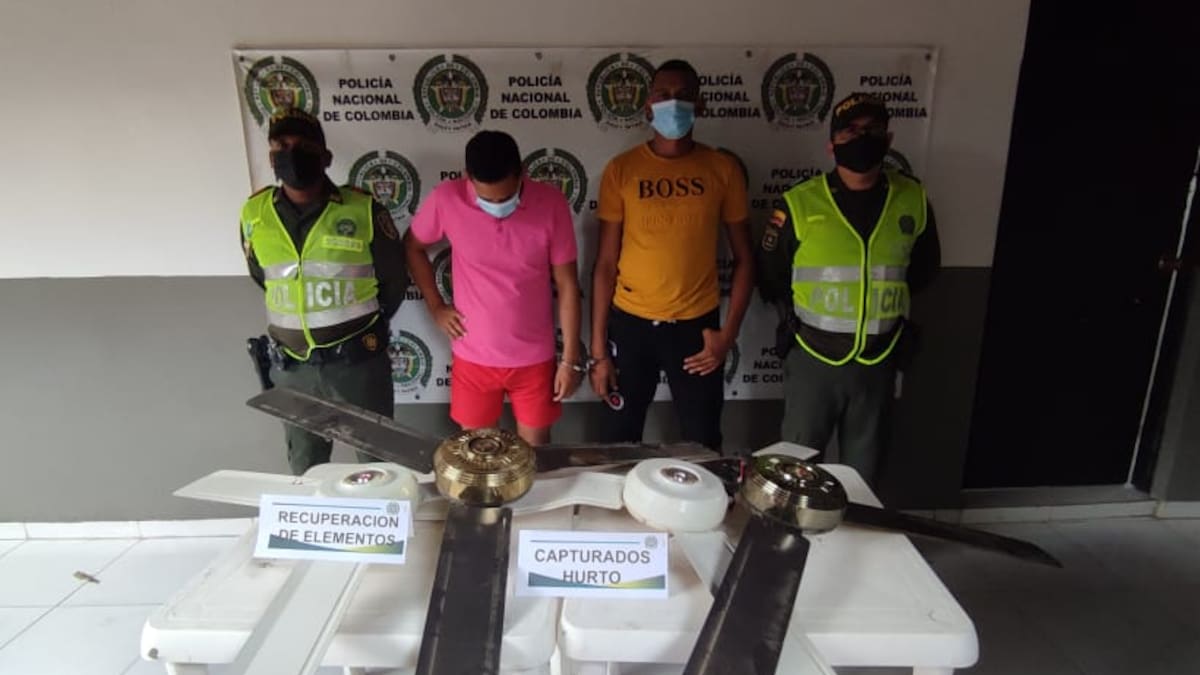 Las autoridades los identificaron como Ángelo Alejandro Núñez Cuadrado, de 27 años y Luis Carlos Panzza Mengual, de 31, ambos residentes y vecinos del colegio, que habrían hurtado cuatro ventiladores de techo, avaluados en 800 mil pesos.