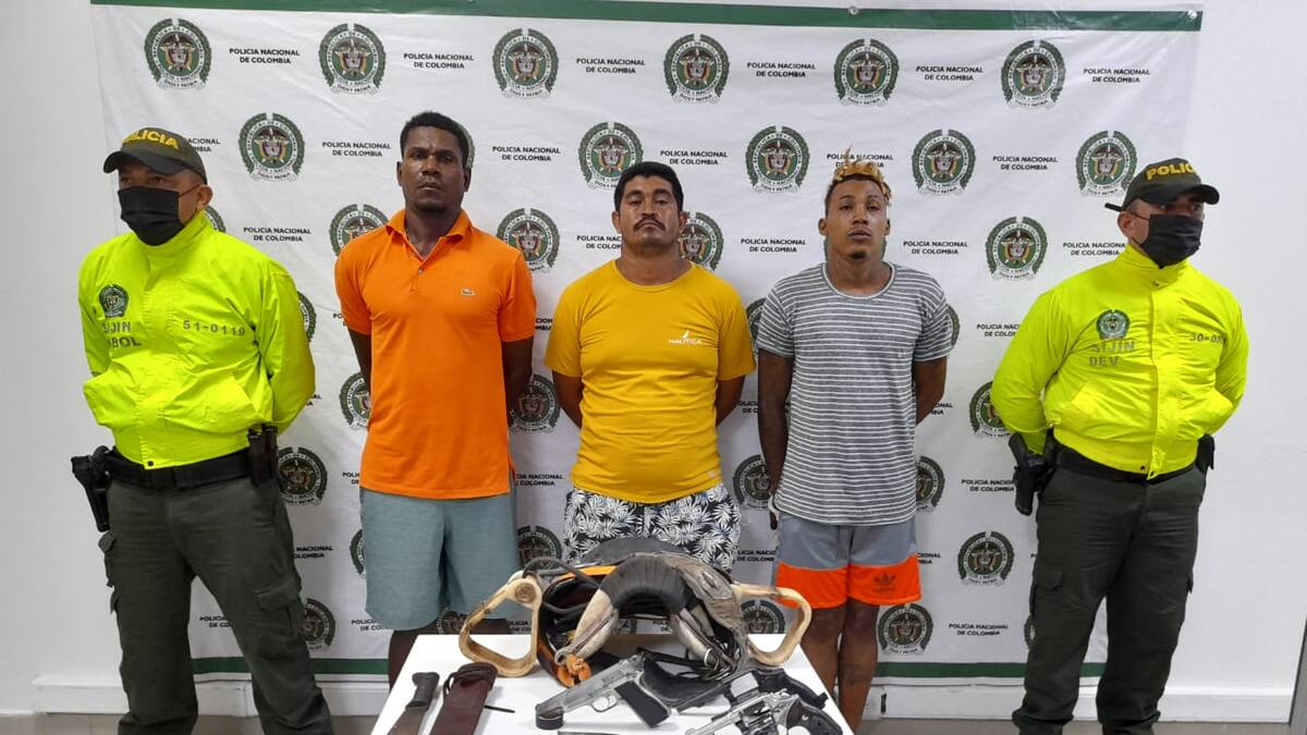 En el procedimiento judicial los uniformados capturaron a tres presuntos integrantes de la banda delincuencial ‘Los Vaqueros’, a quienes les hallaron en su poder dos revólveres calibre 38 largo, una pistola calibre 09 milímetros y municiones, las cuales no registran documentación alguna que acrediten su legalidad.