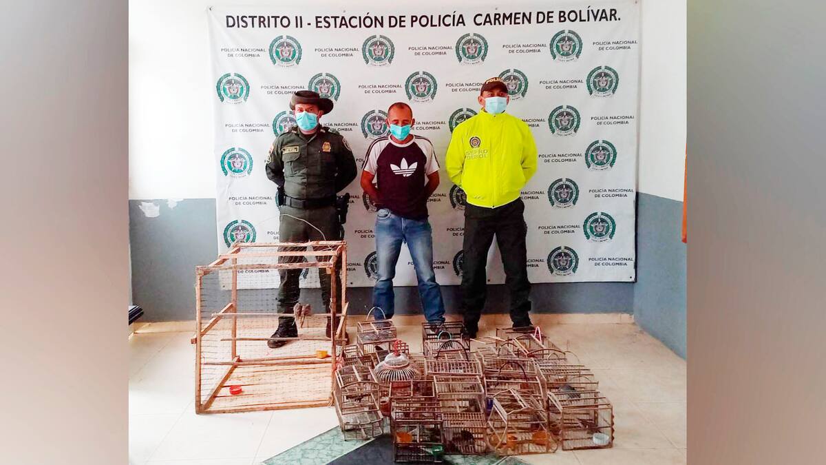 Funcionarios adscritos a la Unidad Básica de Investigación Criminal de la Seccional de Protección de Servicios Especiales del Departamento de Policía Bolívar, en coordinación con Fiscalía 11 Seccional de El Carmen de Bolívar, capturaron en flagrancia a un sujeto en momentos en que llevaba consigo 50 aves silvestres de diferentes especies.