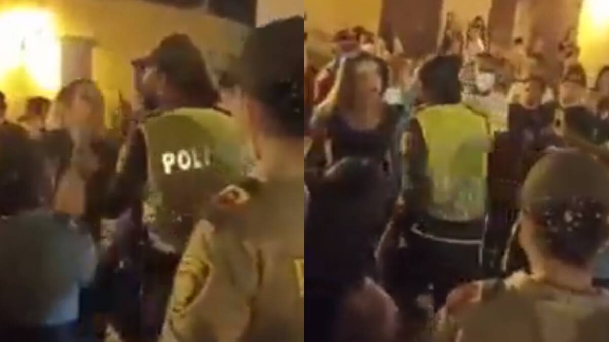 En la grabación se puede observar que las dos mujeres se empujan, se manotean y se golpean, en medio de las rechiflas y gritos de varias personas que estaban en el lugar y de otros uniformados que intentan separarlas.