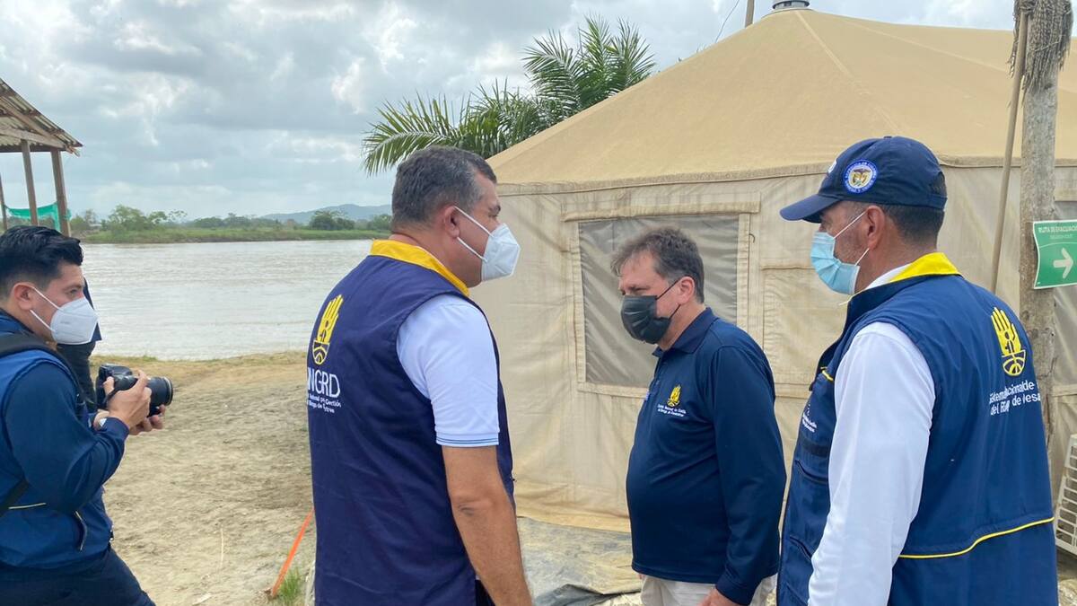 El director de la Unidad Administrativa Especial de Gestión del Riesgo de Desastres y Cambio Climático de Sucre, Andrés Vivero León, y el alcalde del municipio de San Benito, Manuel Cadrazco Salcedo, destacaron los avances y la celeridad en los trabajos que se adelantan para el cierre del boquete en Cara e’ gato, San Jacinto del Cauca (Bolívar).
