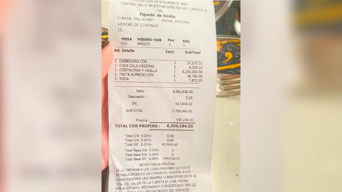 En la imagen de la factura se ve que le cobraron 5.250.000 pesos por 'cristalería y vajilla', supuestamente porque el cliente había roto por accidente un plato del establecimiento. Además, se aprecia que le incluyeron una propina de 534.254 pesos, lo que junto con la comida pedida sumaba $6.3004.194, lo que despertó indignación entre los usuarios de redes sociales.