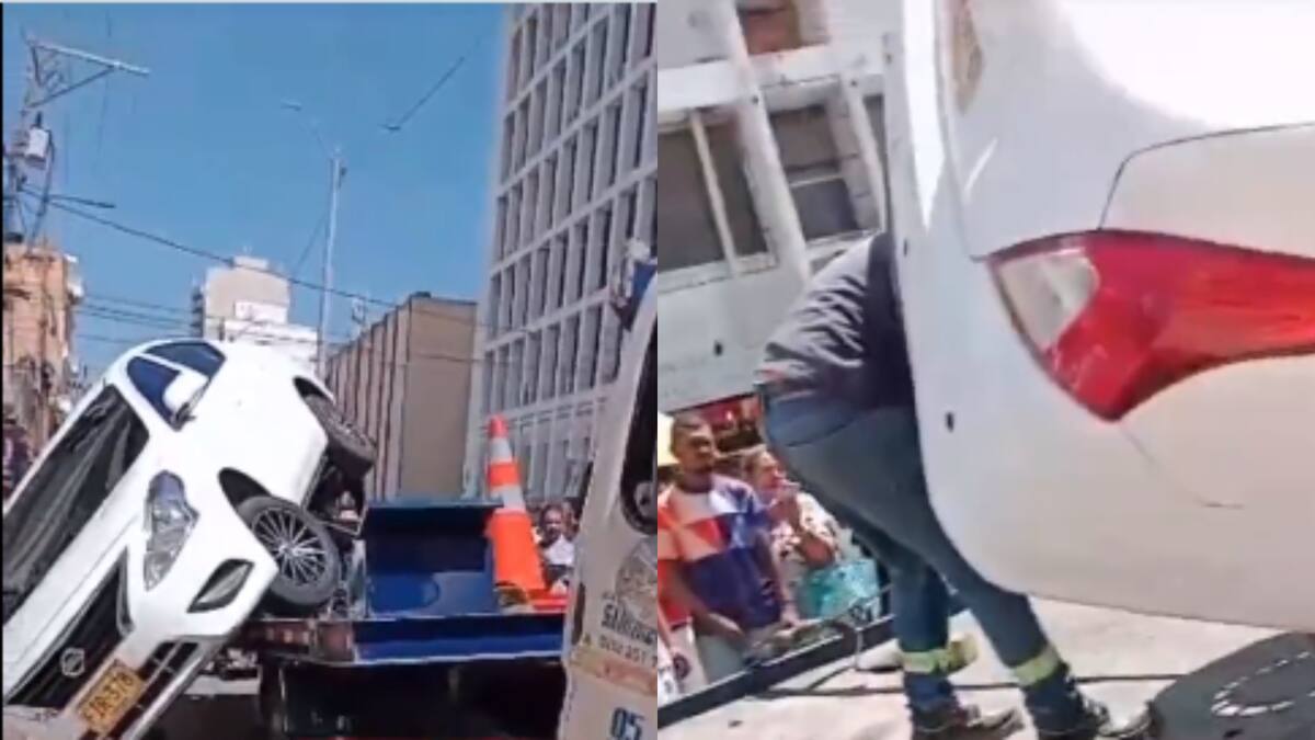 Se conoció que a pleno medio día en la capital bolivarense, un vehículo que estaba siendo remolcado, aparentemente por estar mal estacionado, cayó de la grúa. Ante el hecho, decenas de personas se acercaron para conocer a detalle lo que sucedía, sin importar el fuerte calor que azota por estos días la región Caribe.