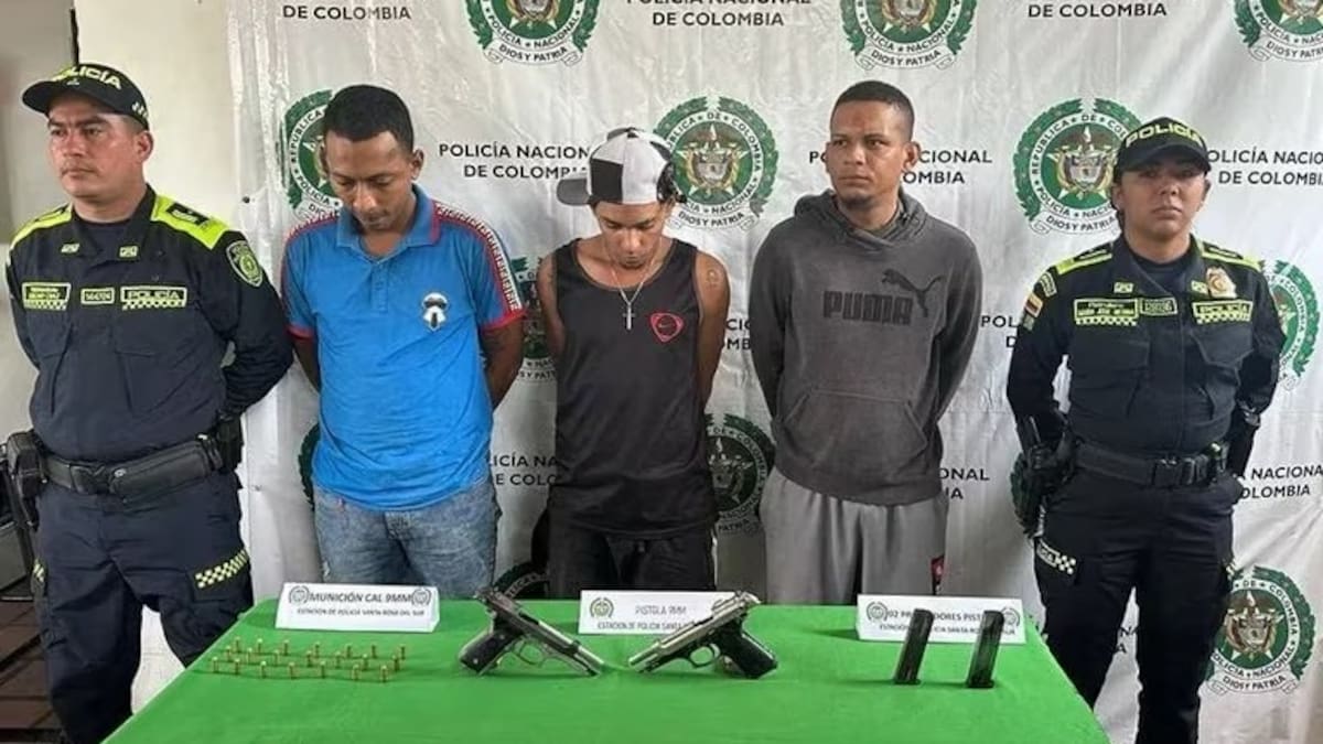 'Gracias a la actividad, la labor de la Policía en la recolección de información tanto en videos de cámaras, como en la información suministrada por la comunidad, se da la ubicación de unas personas que, presuntamente, cometieron este hecho. Al abordarlas la Policía Nacional, se les encuentra unas armas de fuego tipo pistola', dijo el coronel Santiago Garavito, encargado de la Policía del Magdalena Medio.