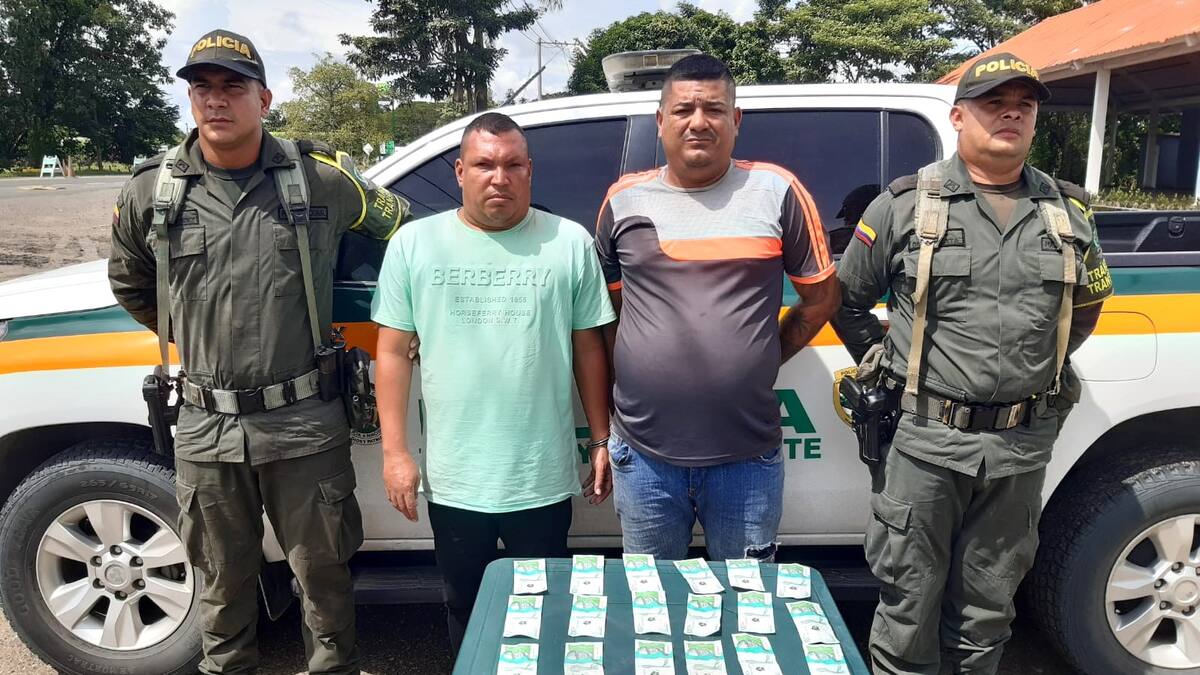 La detención se registró en la ruta San Onofre-Cartagena en medio de un procedimiento de registro y control a una motocicleta en la que se movilizaban los dos hombres que portaban más de dos millones de pesos en efectivo en billetes falsos de 100 mil pesos.