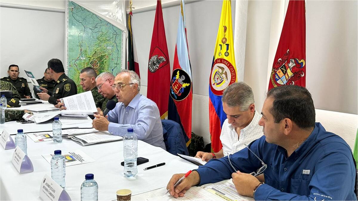 El ministro de Defensa, Iván Velásquez Gómez, preside a esta hora de la mañana del jueves 15 de febrero un consejo de seguridad ampliado en Santa Rosa de Sur, donde aborda toda la problemática de inseguridad que viene afectando a 20 municipios de 4 departamentos que componen la región del Sur de Bolívar.