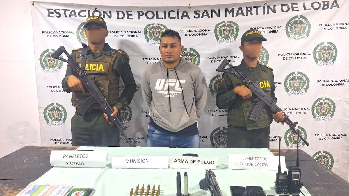 La aprehensión en flagrancia se produjo en el municipio de San Martín de Loba. En medio de una requisa al hombre le hallaron una pistola, dos proveedores, 28 cartuchos calibre 9 mm, dos radios de comunicación y 3 baterías para las mismas, además de 2 cartillas de código de comunicación, 2 antenas, 2 celulares y una agenda de estatuto de constitución y régimen disciplinario de las AGC.