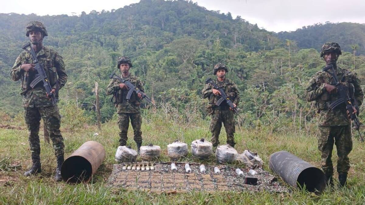 El hallazgo, representado en 12 artefactos explosivos, 7 granadas de fabricación artesanal y más de 900 municiones de diferentes calibres, se produjo tras sostener un combate contra presuntos integrantes la subestructura Euclides Arley Pérez Góez, del Clan del Golfo.