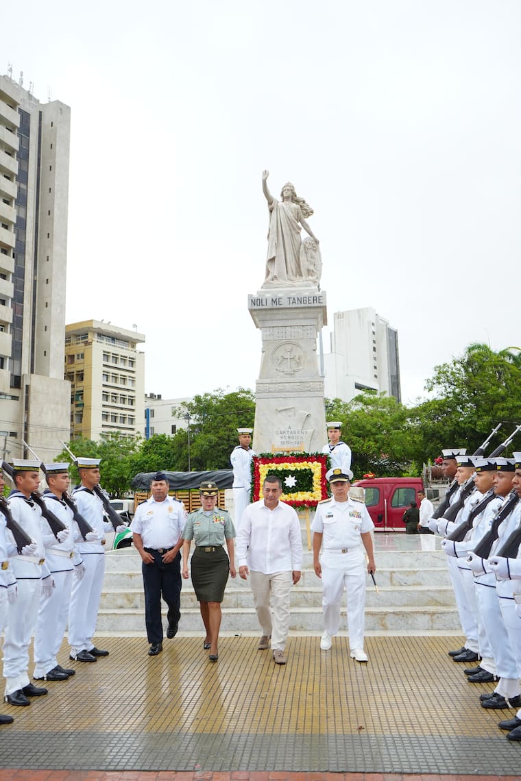 La tradicional ofrenda floral que tuvo como protagonistas al alcalde mayor de Cartagena, Dumek Turbay Paz; la gestora social, Liliana Majana; los uniformados de la Armada Nacional y el Cuerpo de Bomberos, dio inicio a los actos conmemorativos en el Camellón de los Mártires.