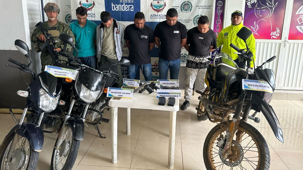 La detención ocurrió en una vía pública del corregimiento. Les hallaron 2 pistolas 9 mm, 40 cartuchos 9 mm, 2 proveedores para la misma, 77 cartuchos, 2 proveedores para fusil, 5 celulares, y 3 motocicletas.