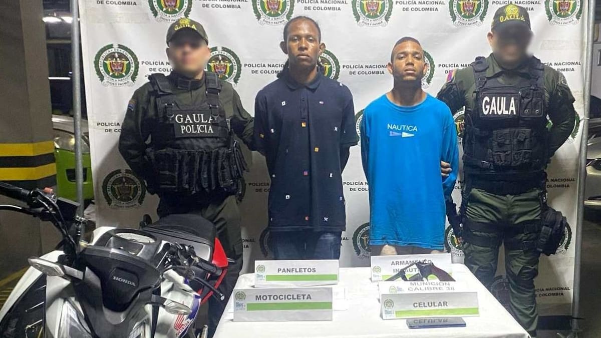 Un operativo especial contra el delito de la extorsión, hizo posible la aprehensión de quienes se movilizaban en una motocicleta portando un arma de fuego (revólver) con 6 cartuchos y 10 panfletos amenazantes a nombre de un grupo armado ilegal.