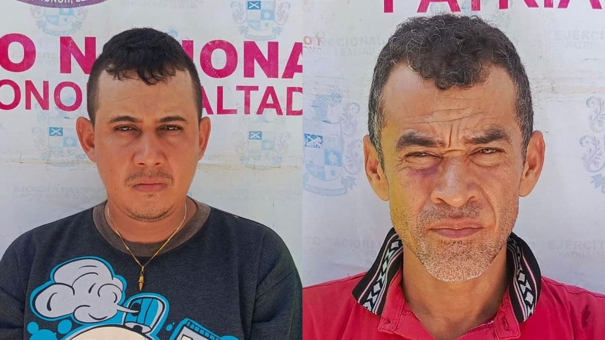 Fueron sorprendidos en un operativo de registro a personas en el que les hallaron una pistola prietro beretta 9mm, un revólver calibre 38, un arma de fuego tipo Changon, tres motocicletas, una granada de fragmentación, nueve cartuchos 9 mm, 11 cartuchos calibre 38, un fusil de aire comprimido y material de intendencia.