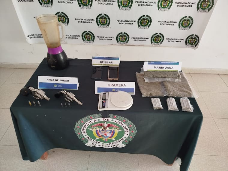 En el procedimiento, los investigadores le incautaron a este ciudadano de 29 años dos revólveres calibre 38, marca Smith & Wesson, 700 gramos de marihuana, 2 celulares y una licuadora.