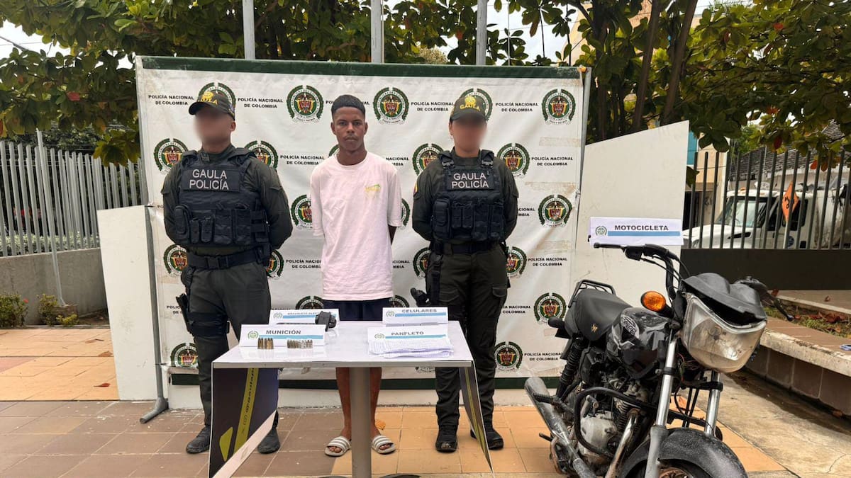 Se trata de alias Totoy, de 20 años, a quien capturaron en desarrollo de una diligencia de registro y allanamiento en la que además le hallaron seis panfletos extorsivos, 14 cartuchos de diferentes calibres, una motocicleta y varios celulares.
