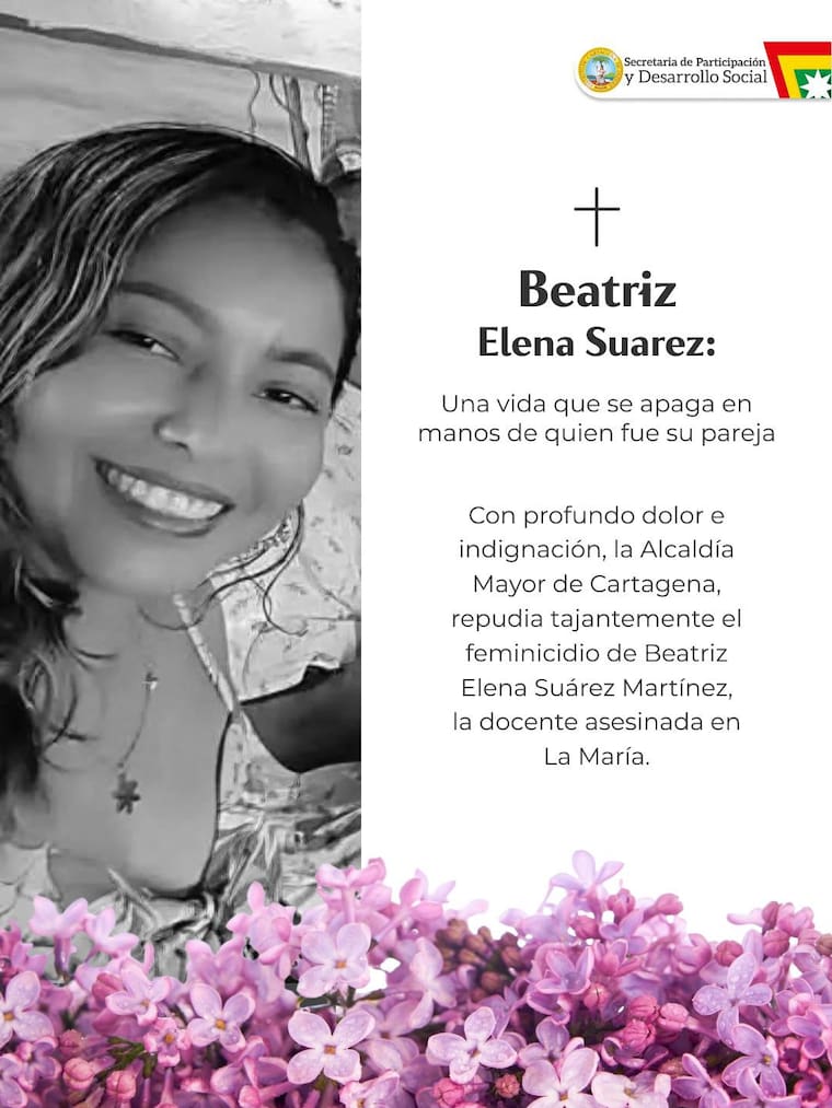 Luego de 24 horas de haber sido asesinada en una vía pública de la ciudad de Cartagena la docente Beatriz Elena Suárez Martínez a manos de su expareja sentimental, la alcaldía mayor se refirió a este aberrante caso.