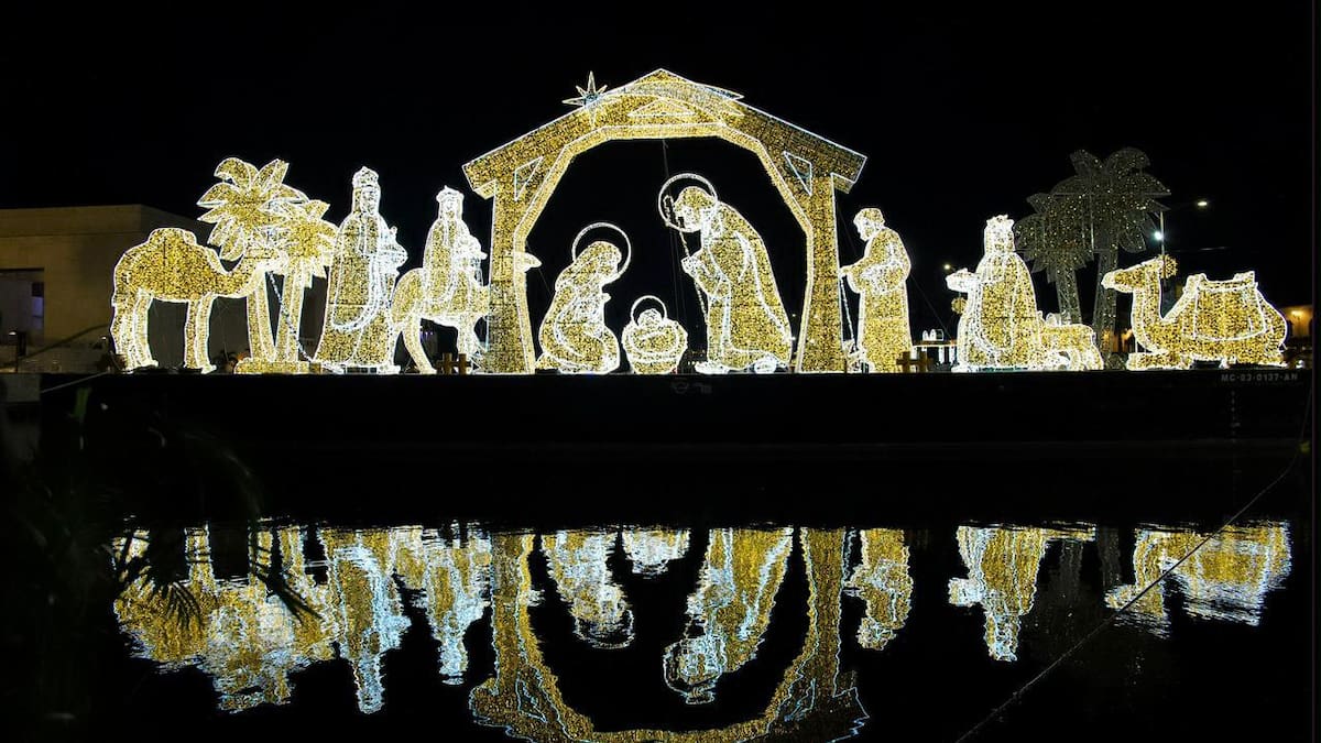 Está ubicado sobre una plataforma de 40 metros de ancho y 12 figuras de 6 metros de alto que incluyen a la Virgen, San José, el Niño Jesús, palmeras, los Reyes Magos y el portal de Belén, son una alegoría al Nacimiento Flotante.
