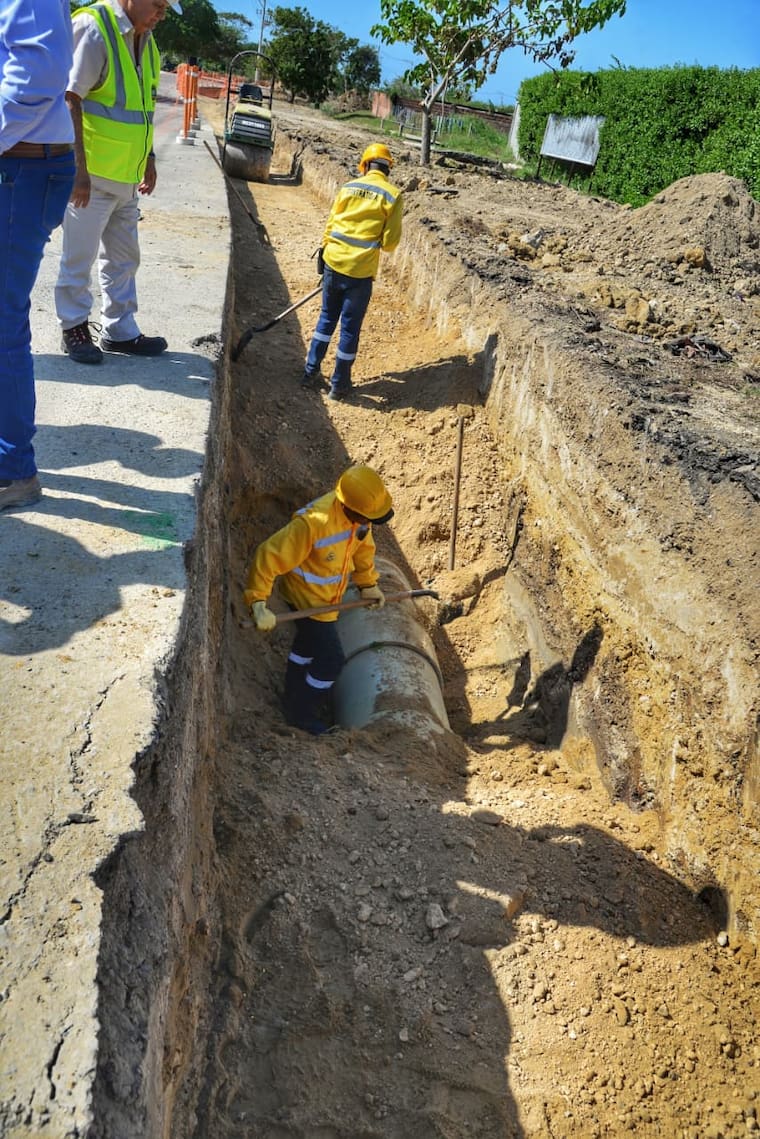 Tanto en Bayunca como en Pontezuela ejecutan trabajos de instalación de redes sanitarias internas, mientras que, de manera paralela, sobre la vía principal a la altura de Punta Canoa, adelantan un frente estratégico de obra correspondiente a la tubería de impulsión que conectará estos corregimientos con la Planta de Tratamiento de Aguas Residuales (PTAR) de Cartagena, ubicada precisamente en Punta Canoa.