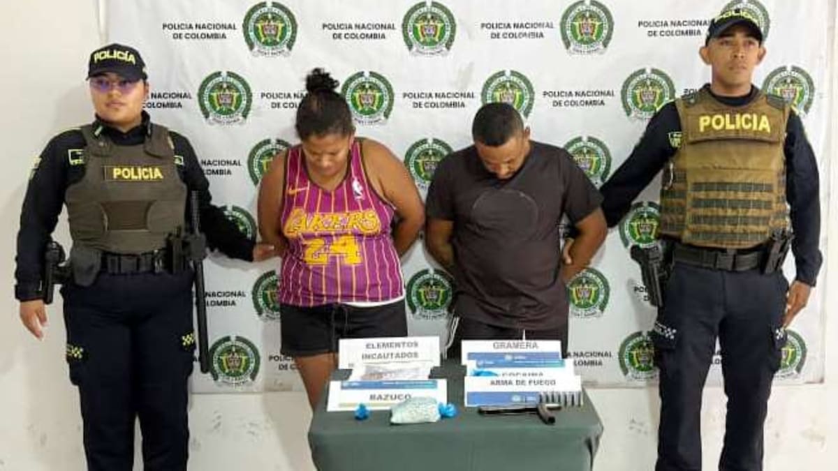 Unidades de la Sijin y del Grupo de Operaciones Especiales (Goes), realizaron las dos diligencias de allanamiento y registro que dejaron como resultado la captura de la pareja, así como la incautación de 50 dosis de cocaína, 210 de base de coca, una gramera, un arma de fuego de fabricación artesanal, 7 cartuchos calibre 38, diez panfletos alusivos al Clan del Golfo y dos teléfonos celulares.
