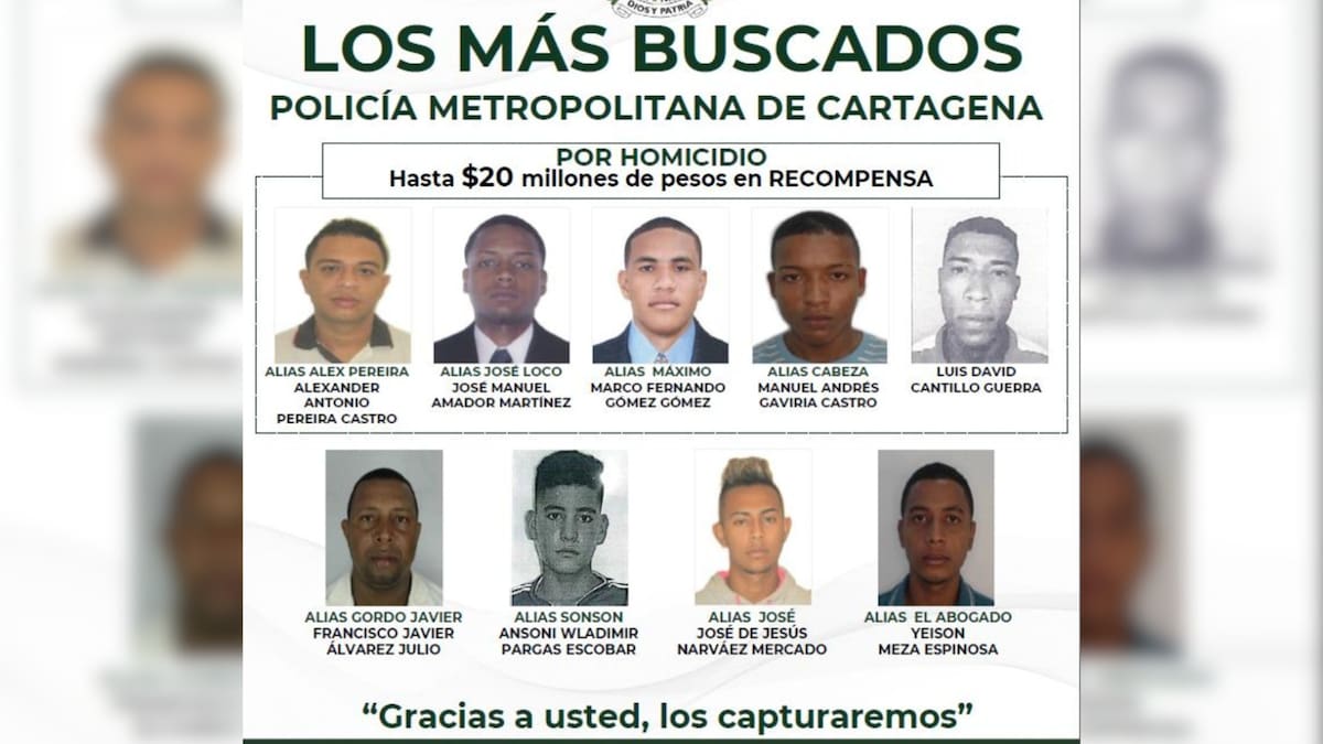 La Policía Metropolitana de Cartagena hizo público el Cartel de los más buscados por homicidio, y con ello anunció una recompensa de hasta 20 millones de pesos por información que permita ubicarlos y capturarlos.