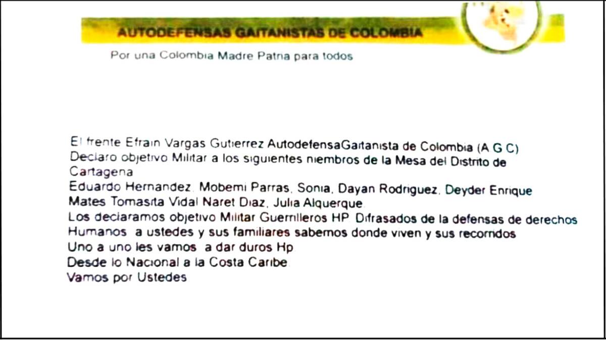 A través de un panfleto el grupo de las Autodefensas Gaitanistas de Colombia amenazó a siete integrantes de esta organización en Cartagena que hicieron llegar a cada uno de los líderes. 'El frente Efraín Vargas Gutiérrez Autodefensas Gaitanistas de Colombia (A.G.C.) declaro objetivo militar a los siguientes miembros de la mesa del distrito de Cartagena: Eduardo Hernández, Mobemi Parras, Sonia, Dayan Rodríguez, Deyder Enrique Mates, Tomasita Vidal, Naret Díaz, Julia Alquerque.' En la misiva el grupo paramilitar declara objetivo militar a estas personas porque los señalan de pertenecer a la guerrilla. El documento es firmado por el Estado Mayor del Frente Efraín Vargas Gutiérrez.