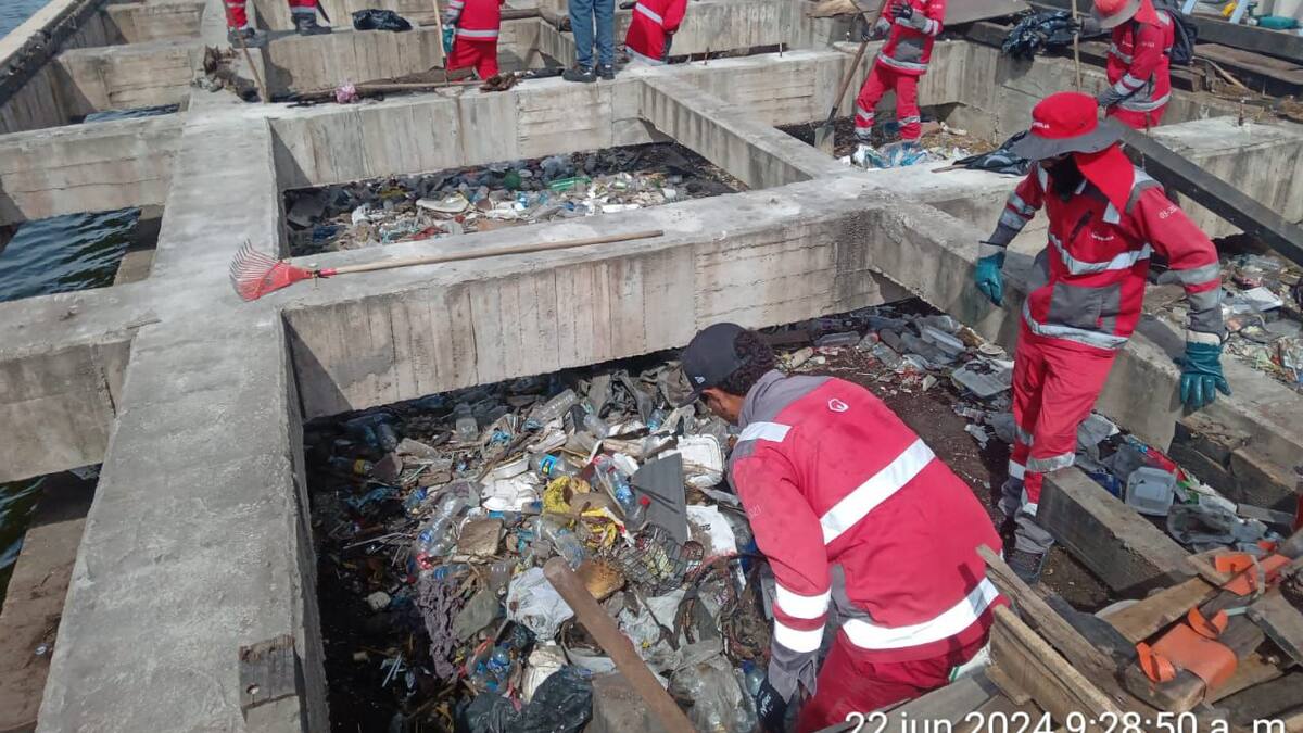 Operarios de la empresa Veolia fueron los encargados de limpiar la parte baja del muelle de madera de La Bodeguita que será intervenido.
