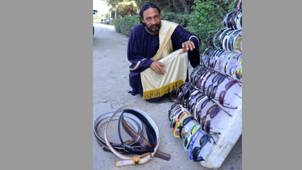 Ora en la noches y en las mañanas recorre Pasacaballos con sus sandalias que lo protegen de las arenas y sardineles calientes. Vende gafas a cinco mil pesos; también correas a diez y estuches para celulares.
