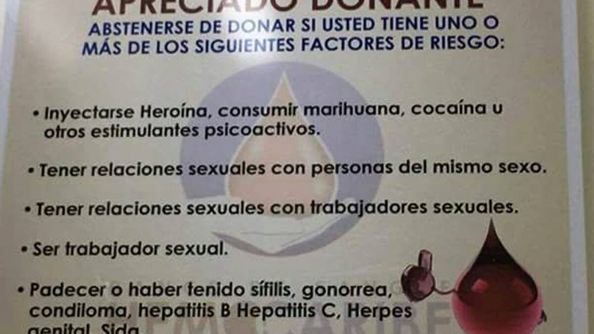 En el cartel, que consta de cinco puntos, se lee: 'Apreciado donante, abstenerse de donar si usted tiene uno o más de los siguientes factores de riesgo: (…) tener relaciones sexuales con personas del mismo sexo, tener relaciones sexuales con trabajadores sexuales, ser trabajador sexual', dicen el puntos segundo, tercer y cuarto del aviso.