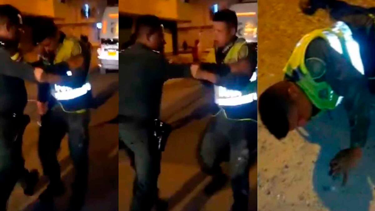 En el video se observa a uno de los policías que cae al suelo y es auxiliado por su compañero. Cuando se levanta camina tambaleante y con rastros de sangre en el rostro. 'El mismo compañero lo golpeó con la patrulla. Estrelló un carro y se dieron a la fuga', grita uno de los hombres que presenció la escena.