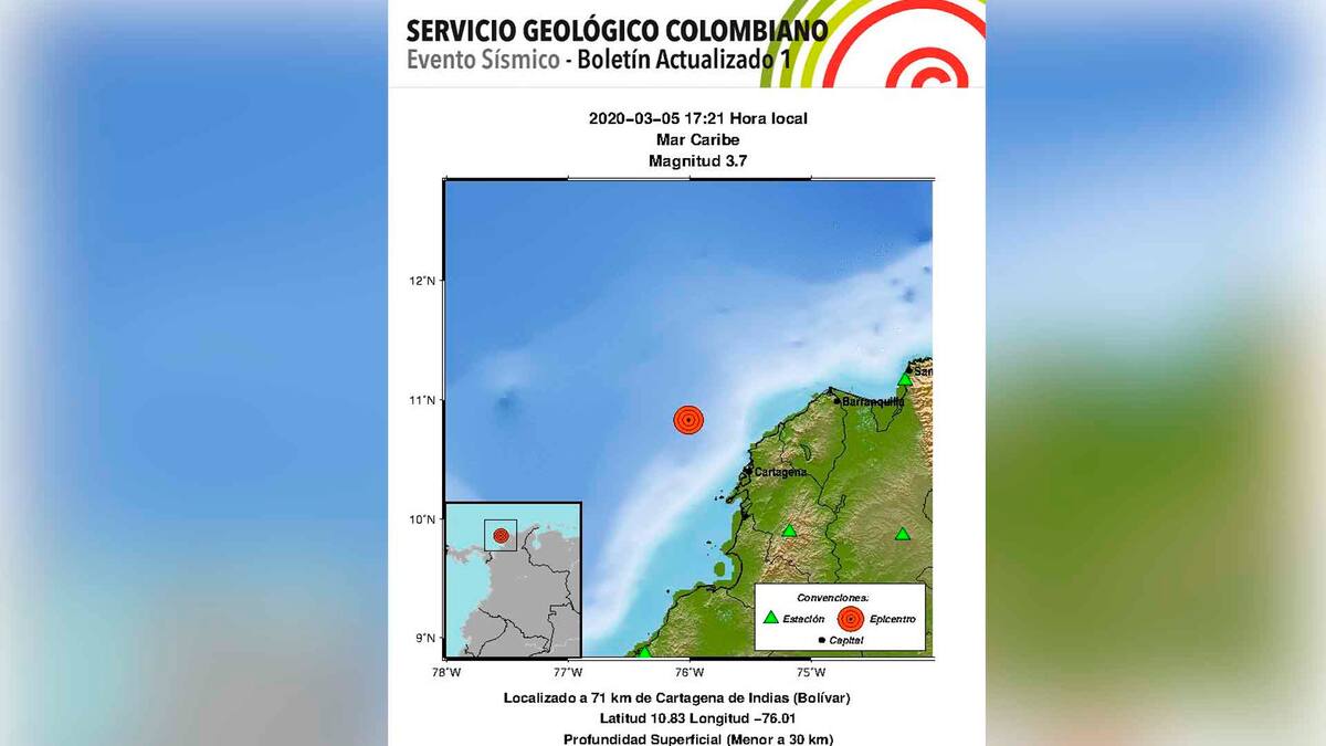 Un sismo de magnitud 3.7 se registró en la tarde de este jueves en el mar Caribe, a unos 71 kilómetros de Cartagena.